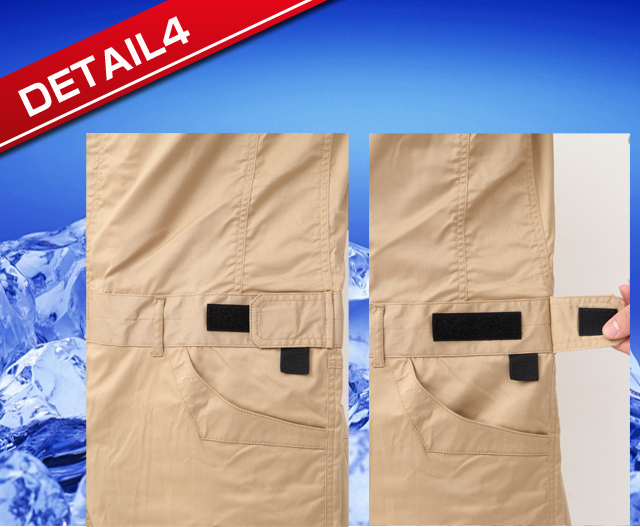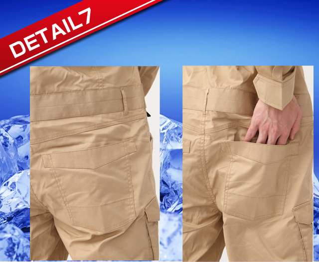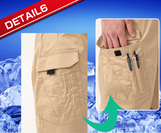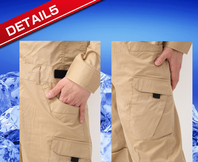 通常のポケットプラスカーゴポケットで収納力は抜群。膝の部分にダーツを呼ばれるつまみを取りしゃがんでも突っ張らないような構造になっている。