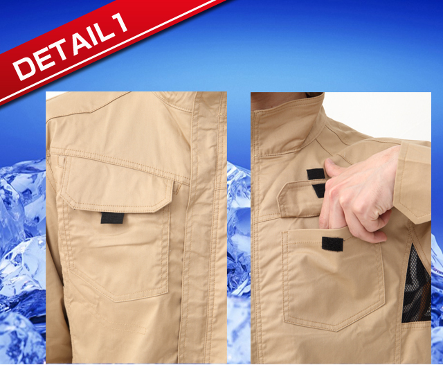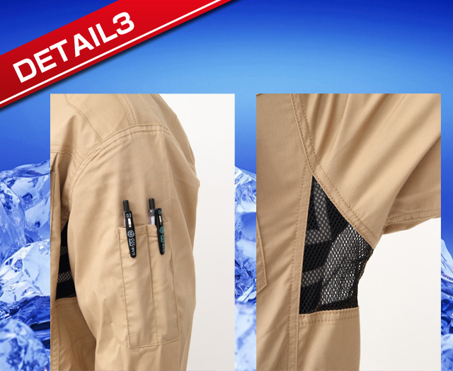 左袖には定番のペンサシ装備。幅6cm高さ12cm。生地を少し寄せて縫い付けてあるためペンがさしやすくなっています。メッシュは後ろ側にも同じ大きさのものが付いているので通気性は抜群。